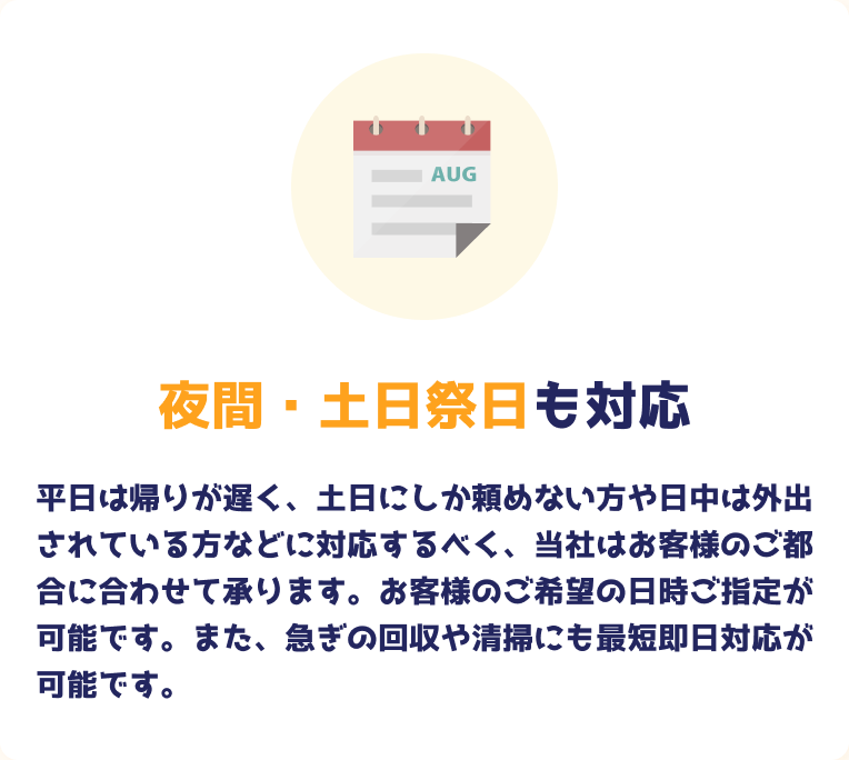 深夜・早朝の回収も可能です。 ご予約は2時間枠でお取りしておりまして、前の作業状況や交通状況によってある程度前後してしまいます。 予めご了承ください。 作業スタッフより、到着30分前にご連絡させていただきます。